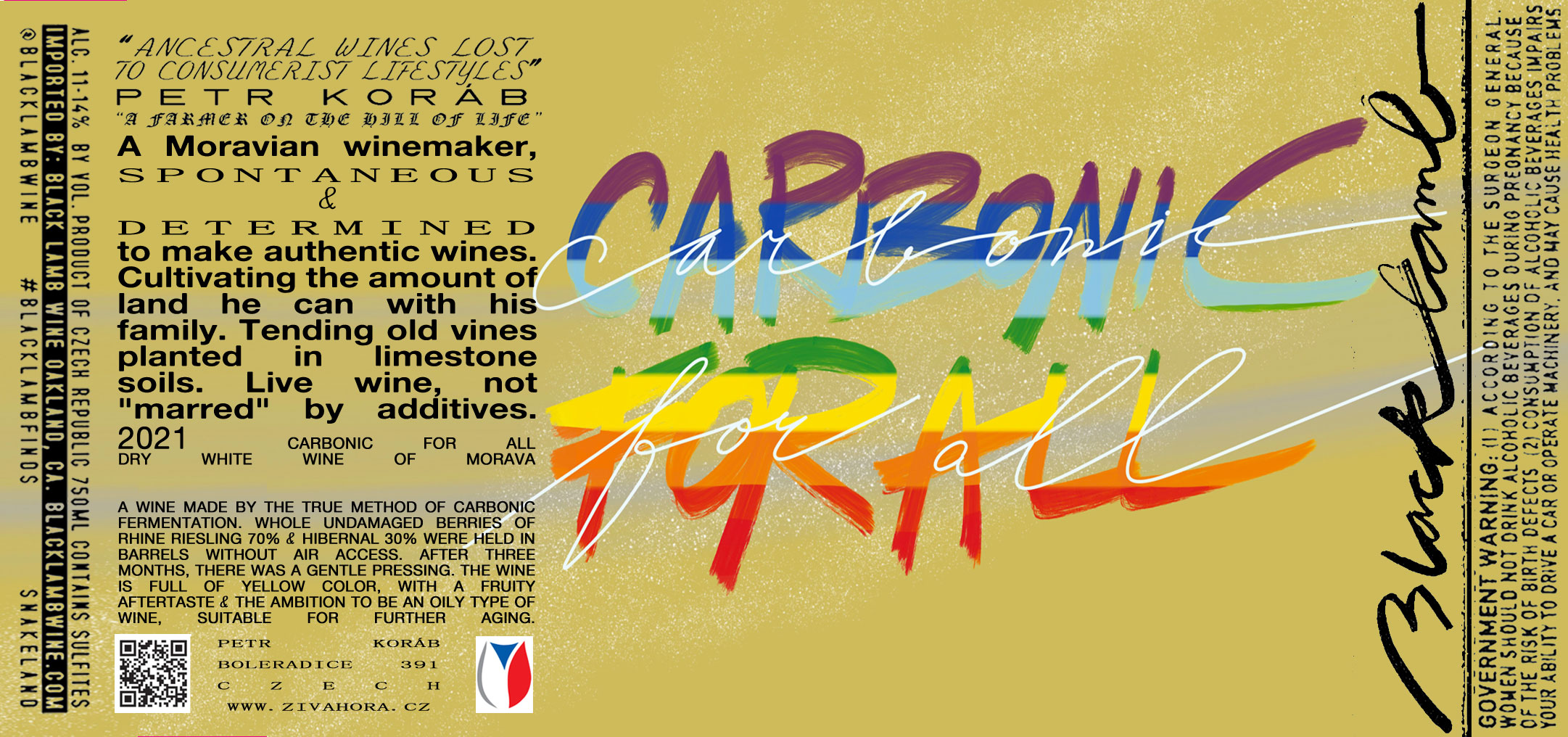 “Carbonic For All” is a wine made by the true method of carbonic fermentation. Whole undamaged berries of Rhine Riesling 70% and Hibernal 30% were held in barrels without air access. After three months, there was a gentle pressing. The wine is full of yellow color, with a fruity aftertaste and the ambition to be an oily type of wine, suitable for further aging. The label was created by Dante Minutello.